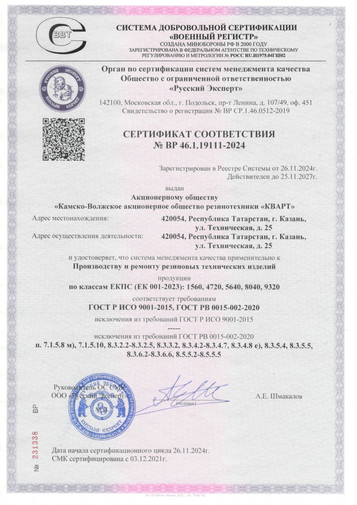 Система менеджмента качества нашей компании сертифицирована АО "Бюро Веритас Сертификейшн Русь" на соответствие требованиям международных стандартов ISO 9001:2015 и IATF 16949:2016, а также АО "Русский Регистр" по военному стандарту ГОСТ РВ 0015-002-2012