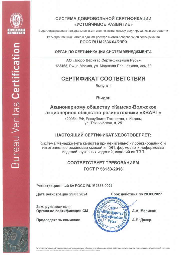 Система менеджмента качества нашей компании сертифицирована АО "Бюро Веритас Сертификейшн Русь" на соответствие требованиям международных стандартов ISO 9001:2015 и IATF 16949:2016, а также АО "Русский Регистр" по военному стандарту ГОСТ РВ 0015-002-2012